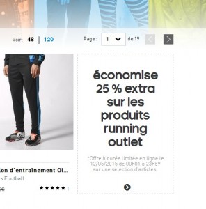 25 pourcent de réduction sur les articles de running Outlet qui sont déjà à prix réduits donc … Une offre le 12 mai uniquement … La remise se fait automatiquement dans le panier …