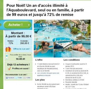 Pour les parisiens, si vous aimez aller régulierement au parc aquatique Aquaboulevard, bonne affaire pour vous sur groupon : en effet on peut acheter les cartes annuelles d’accces avec pres de 70% de remise .. 99 euros la carte adulte au lieu de 359 , 69 euros la carte enfants ..
