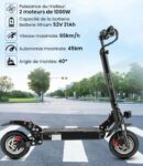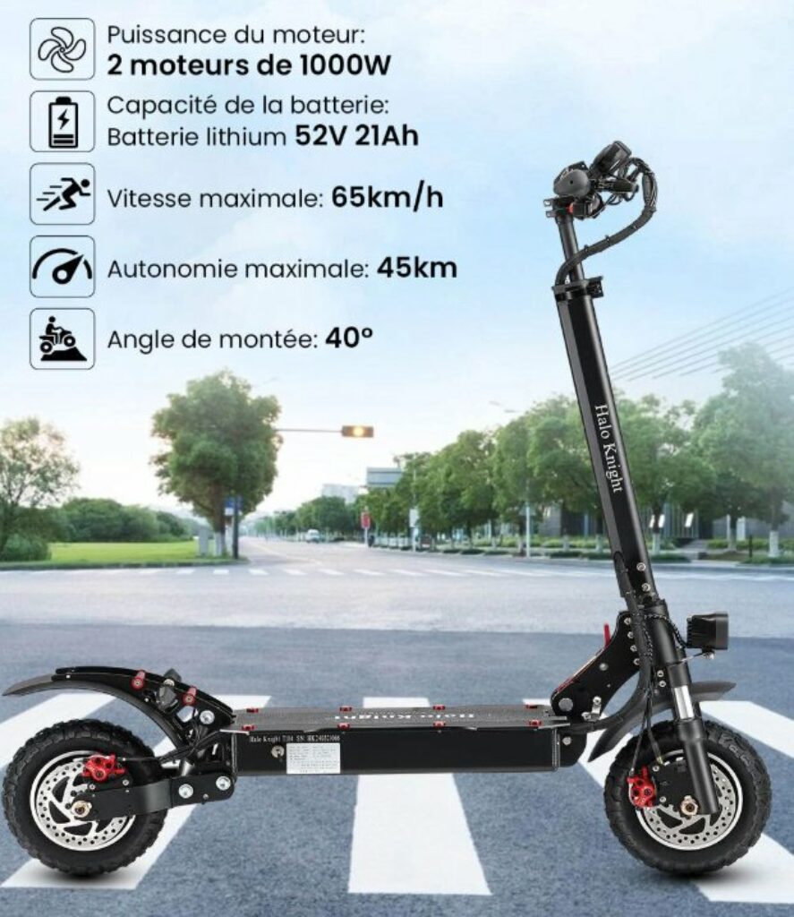 La Halo Knight T104 se distingue par sa motorisation bi-moteur de 2000W (2 x 1000W) – un au niveau de chacune des roues , capable d’atteindre jusqu’à 65 km/h (bridée à 25 km/h pour la législation française). Sa batterie lithium 52V 21Ah assure une autonomie jusqu’à 45 km en mode simple, ce qui la rend adaptée aussi bien aux déplacements quotidiens qu’aux longues balades.