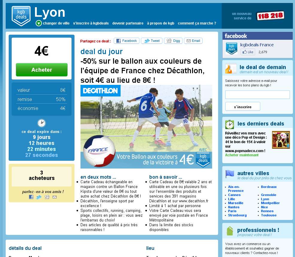 Vous faites des achats chez Decathlon ? Profitez de l’offre proposée par kgbdeal ( ) , qui vous permet d’acheter pour 4 euros un bon d’achat de 8 euros valable dans tous les magasins decathlon et sur tous les produits .