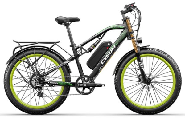 Le vélo électrique CYSUM M900 est un fatbike 26 pouces tres puissant avec un moteur de 1000 watts .. Avec des grandes roues de 26 pouces équipées de pneus de 4 pouces de largeur .. Il est équipé de quasi tout ce que l’on peu désirer : des freins hydrauliques, une suspension intégrale avant et arriere .. une batterie de 816wh , mais aussi 9 vitesses manuelles avec un dérailleur shimano …. Et on peut l’acheter au prix le plus bas avec l’offre suivante