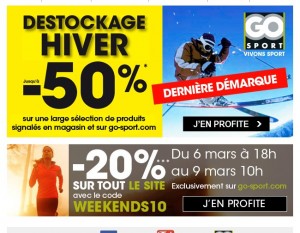 Promo Go Sport : derniere démarque articles de sports d’hiver , et 20 pourcent sur le reste jusqu’au 9 mars