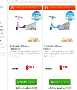 Vous avez des petits enfants et pour les beaux jours vous voulez leur acheter une trottinette ? Sur cdiscount, il y a deux modèles de trottinette 3 roues à moins de 9 euros .. Un bleu pirate pour les garçons et une rose princesses pour les filles ..