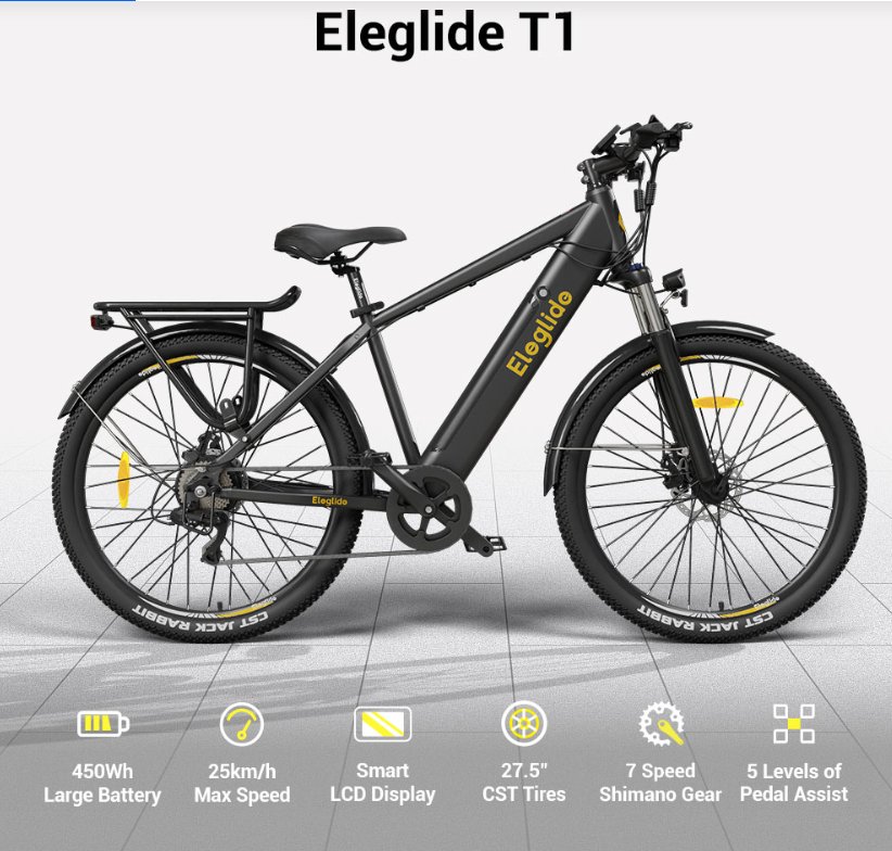 Le vélo de randonnées ( trekking) Eleglide T1 est un vélo qui dispose de roues de 27.5 pouces, une batterie de 450 wh qui permet une autonomie qui peut aller jusqu'à 100kms en mode assistance ... l'Eleglide T1 dispose d'un moteur de 250 watts , qui peut fonctionner en mode assistance ou completement electrique avec 5 niveaux de vitesse ( 12/16/20/23/25 km/h ).. La vitesse maximale est de 25km/h Le vélo est equipé de d'un derailleur shimano et de 7 vitesses il pese 26kgs il est équipé de lampe à l'avant et à l'arriere , de garde boue et d'un porte bagage arriere .. le genre de vélo qui permet d'envisager de partir plusieurs jours , pour faire par exemple l'un des nombreux parcours en piste cyclable qui existe en France ( la via rhona , la voie verte , la via fluvia ...) .( sous réserve de pouvoir recharger la batterie durant les étapes )