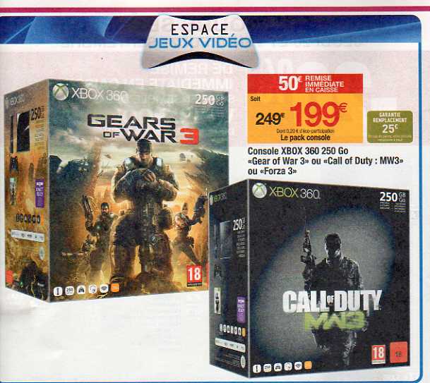 Home » High Tech » 199 euros les pack xbox360 250go + mw3 ou Gow3 chez carrefour jusqu’au 25 septembre 199 euros les pack xbox360 250go + mw3 ou Gow3 chez carrefour jusqu’au 25 septembre riczo 19 septembre 2012 High Tech, Supermarchés SaveSavedRemoved 0 Le retour des packs XBOX360 250go à moins de 200 euros ! dans les hyper carrefour les packs xbox360 250go avec les jeux Gears of war3 ou call of duty Modern warfare 3 sont à 199 euros .. (249 – 50 de remise immediate ..)