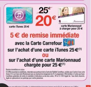 20 euros les cartes cadeaux itunes et marionnaud de 25 euros chez carrefour jusqu’au 25 mai