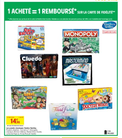 du 17 au 29 octobre , chez INTERMARCHE ( Supermarché et Hypermarché ) une sélection de jeux de société de la marque HASBRO font l’objet d’un remboursement à 100% sur la carte de fidélité