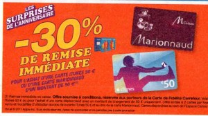 Super affaire dans les magasins carrefour du 5 au 11 octobre : pour les porteurs de la carte de fidelité gratuite du magasin, les cartes cadeaux Marionnaud et Itunes d’une valeur de 50 euros font l’objet d’une remise immediate de 30 % ..