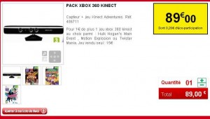 S’il vous faut un capteur kinect pour votre console xbox360 , il y a une bonne affaire dans les hyper auchan : en effet pour 89 euros on a le capteur kinect + le jeu kinect adventures , et pour 1 euro de plus un jeu au choix parmi : Hulk Hogan’s Main Event , Motion Explosion ou Twister Mania …