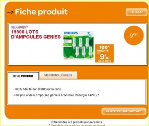 Si vous avez besoin d’ampoules, profitez de l’offre qui sera proposée le jeudi 3 fevrier dans les magasins carrefour . En effet pour les porteurs de la carte de fidelité du magasin, le lot de 6 ampoules 14W economiques de la marque PHILIPS vendues 9.9 euros sera remboursé sur la carte fidelité.