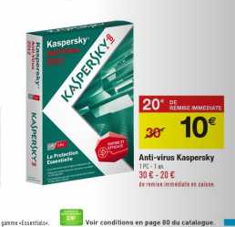 Si votre antivirus vient bientot à expiration, profitez de l’offre presente dans les hyper carrefour du 17 au 24 janvier 2012 .. l’antivirus Kaspersky 2012 1 poste / 1 an est à 10 euros (30 euros – 20 euros de remise immediate ) ..