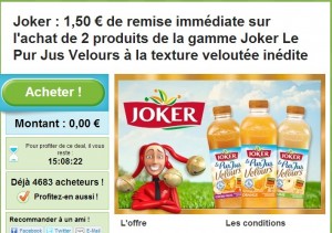 Nouvelle offre de bons de reduction sur groupon pour l’achat de produit alimentaire : cette fois ci on peut donc obtenir gratuitement un bon de réduction de 1.5 euros valable pour l’achat de 2 boissons Joker le pur velour ..