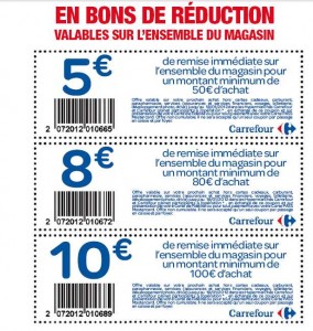 Economisez encore plus par rapport aux prix soldés dans les magasins carrefour gràce à des bons de reduction permettant d’obtenir des remises immediates en caisse : 5 euros de remise pour 50 d’achats ,8 pour 80 et 10 pour 100 d’achats ..