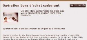 Chez carrefour et carrefour market, à condition de faire un plein d’au moins 50 euros , on recoit un bon d’achat de 3 euros à dépenser en magasin (cliquez ici pour voir le detail de l’offre sur le site carrefour – il faut retirer le bon à l’acceuil du magasin en presentant la facture ou ticket ) .