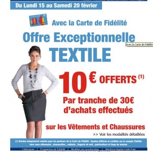 – Pour tout achat, du 15 au 21 février 2010, effectué dans l’un de nos hypermarchés Carrefour participant, Carrefour vous offre 10€ en remise différée créditée sur le Compte Fidélité, par tranches de 30€ d’achats sur les vêtements et les chaussures (hors sous vêtements, chaussettes, collants, lingerie de nuit, puériculture et linge de maison).