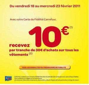 Carrefour : 10 euros sur carte fidelité pour 30 d’achats en vétement jusqu’au 23 février