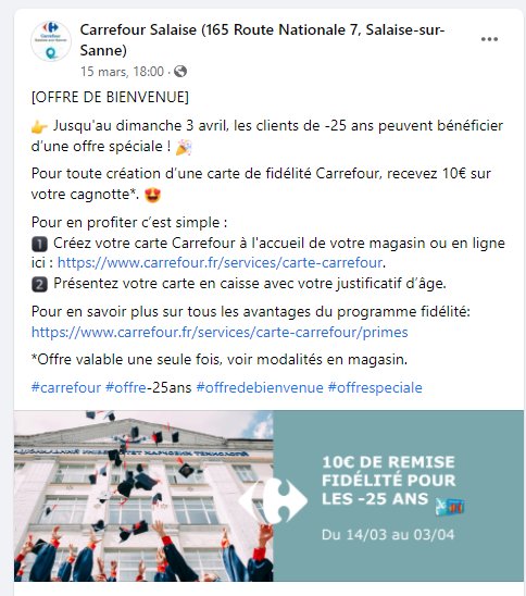 En effet , du 14 mars au 2 avril , l’enseigne Carrefour propose une offre promotionnelle à destination des moins de 25 ans et pour la creation d’une carte de fidelité , il va y avoir 10€ de crédité sur celle ci.