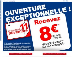Dans les magasins carrefour (hyper) ouverts le 11 novembre, vous recevrez si vous faites des achats pour au moins 80 euros, un bon d’achat de 8 euros ..