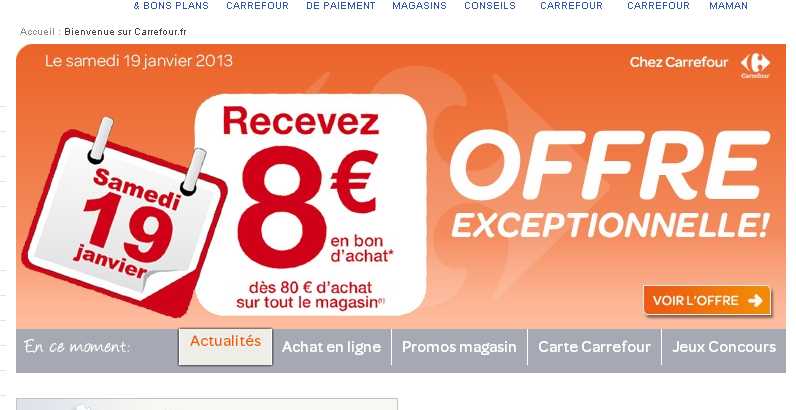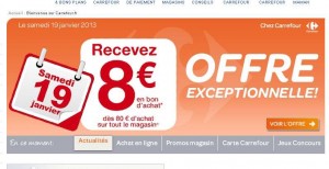 Ce jour 19 janvier à carrefour (en hypermarchés ) , pour 80 euros de courses on recoit un bon d’achat de 8 euros ..