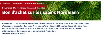 Entre les 5 et 7 decembre , pour l’achat d’un sapin de Noel de 20€ ou plus chez Carrefour Market , on recupere un bon d’achat de 10€ à utiliser ensuite en magasin