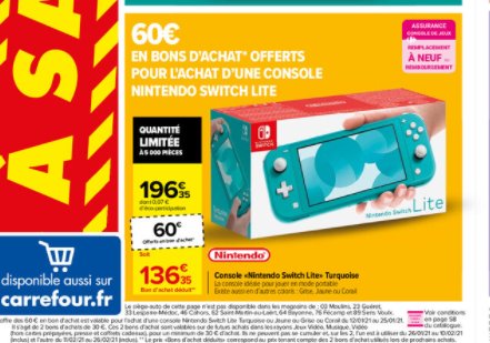 Une tres bonne affaire aussi pour qui desire une console NINTENDO SWITCH , avec le modele LITE qui revient à 136€ seulement grace à 60€ de crédit sur la carte carrefour
