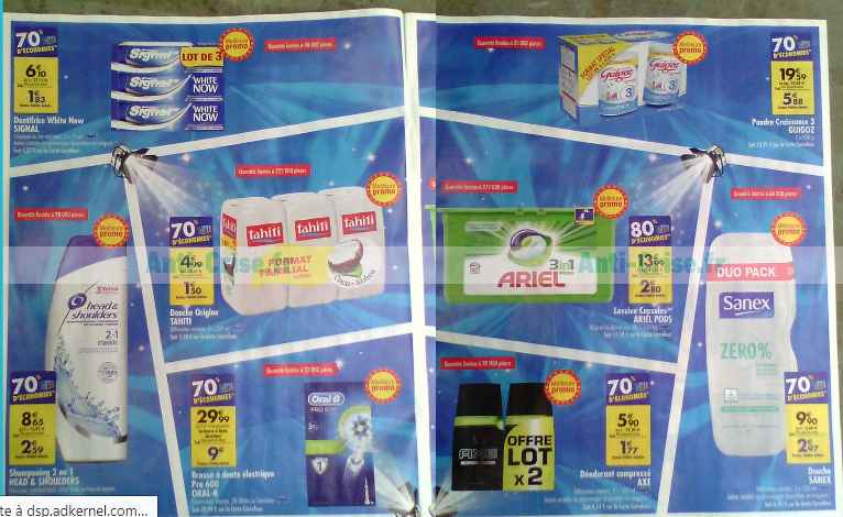 Avec de nombreux produits bénéficiant de 70% sur la carte de fidélité : café , saumon, jambon, lessives , gel douche , 7up , du champagne … mais aussi de nombreux produits avec 50% de réduction dont du nutella , orangina , huile , Martini …