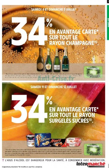 Ainsi par exemple les 4 et 5 juillet , on peut voir 34% d’avantages carte sur tous les champagnes, les 11 et 12 juillet, 34% sur tous les surgeles ( les glaces notamment … )