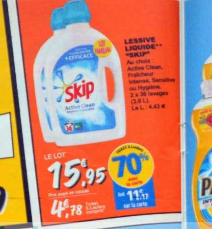 Dans celui ci on peut notamment voir une offre tres interessante sur de la lessive, avec un lot de deux lessives liquides SKIP (2×36 lavages) , vendu à 15.95€ et qui bénéficie de 70% de crédit sur la carte de fidélité Leclerc