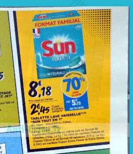 Notamment un lot de tablettes lave vaisselle Sun qui revient ainsi à 2.45€