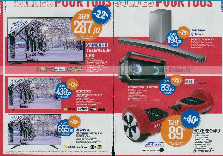 Même si les catalogues sont differents, il semble que certains produits sont presents dans les differents prospectus : comme l’overboard takara à 89€ , la tv samsung à 289€ , l’ordi thomson à 249€ ….