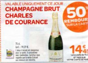 Si vous voulez des bouteilles de champagnes sans avoir à depenser beaucoup d’argent , profitez de l’offre « YapYap » du mardi 15 mars dans les magasins carrefour : Ce jour là effectivement, vous pourrez trouver des bouteilles de champagnes Brut Charles de Courance vendues 14 euros 45 mais faisant l’objet d’un credit de 50 pourcent sur la carte de fidélité (l’argent etant utilisable le mois suivant sous forme d’un bon d’achat « cheque de fidélité » pour regler ses courses en tout genre dans n’importe quel magasin carrefour )