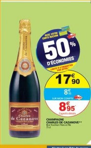 En effet la bouteille de champagne Charles de Cazenove est vendue 17.90 euros mais fait l’objet d’un credit immediat de 8.95 euros sur la carte de fidelité Auchan ..