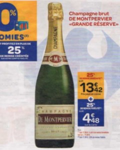 Ceci à condition de posséder la carte de fidélité gratuite des magasins de l’enseigne : En effet , la bouteille de champagne brut « de Montpervier » est vendue 13,42 euros mais avec un crédit sur la carte de fidélité de 4 euros 48 ce qui fait un prix de revient de 8.94 euros .