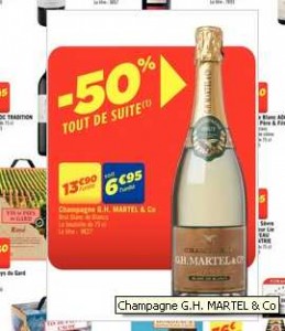 A priori tres bonne affaire champagne dans les supermarchés casino : en effet jusqu’au 13 avril 2013 , il y a 50% de remise immédiate sur une bouteille de champagne Martell Blanc de Blanc Brut .. Affichée initalement à 13.95 son prix en caisse est donc de 6.95 euros ..