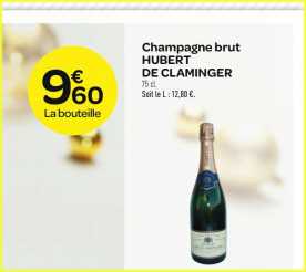 Du 16 au 24 decembre dans les magasins carrefour , la bouteille de champagne brut Hubert de Claminger est à 9,60 euros.Sur cette meme periode se trouve egalement dans ces memes hypermarchés les 2 bouteilles de champagne Charles de Cazenove à 22 euros (soit 11 euros la bouteille) – (au meme prix donc que chez geant casino – voir plus bas )