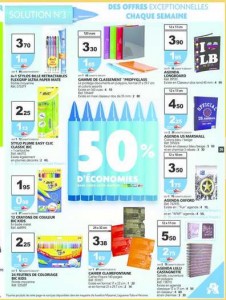 les vacances viennent de commencer , mais voilà qu’auchan propose la premiere promo interessante concernant des fournitures scolaires .. Sur le catalogue valable jusqu’au 16 juillet, il y a en effet 50% de crédit sur la carte de fidelité sur plusieurs articles : 12 crayons de couleurs bic qui reviennent ainsi à moins de 1 euro , 24 feutres bic qui reviennent à 1.12 euros, des cahiers clairefontaines qui reviennent à 1.70 euros …