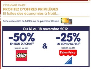 Du 16 au 18 /11 il y a 50% de remboursé sur un jouet lego , et 25% sur les jouets fisher price ..