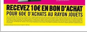 Dans les hypermarchés Geant les 11 ,12 et 13 novembre (pour ceux ouverts ce jour là ), vous recevrez un bon d’achat de 10€ si vous achetez pour plus de 60 euros de jouets (mais pas les jeux videos et consoles ).