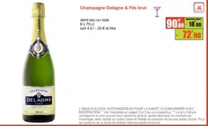 Le carton de 6 bouteilles de champagne Delagne est à 90 euros avec 18 euros de credit sur la carte de fidelite . Le jeudi le credit etant doublé,