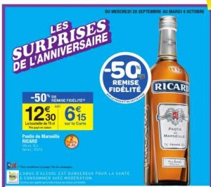 Super affaire si vous aimez le pastis : du 28/09 au 4 octobre , la bouteille de Ricard 70cl revient à 6 euro 15 dans les magasins carrefour à condition de posseder la carte de fidelité gratuite du magasin :