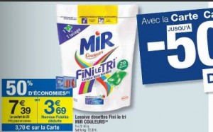 Super affaire lessive du 13 au 19 novembre dans les hyper carrefour : en effet le paquet de 20 dosettes fait l’objet de 50% de credit sur la carte de fidelité, vendu ainsi 7.39 on recupere donc 3.69 euros sur la carte .. Mais par ailleurs, sur le site coupon networks on peut obtenir un bon de reduction de 2 euros que l’on pourra generalement presenter sans probleme à la caisse .. Et donc le paquet reviendra à 1.69 euros ..
