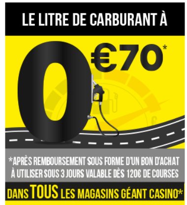 Durant cette periode , on peut donc faire son plein dans la station Geant Casino au prix affiché à la pompe , mais on recevra ensuite à l’acceuil du magasin un bon d’achat egal à la difference entre le prix payé et le prix si le litre etait à 0.70€ ..
