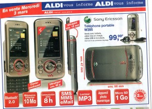 Vous avez besoin d’un nouveau telephone mobile ? L’offre proposée par Aldi dans ses magasins le 3 mars 2010 (et uniquement ce jour là ) peut peut etre vous interesser : Le Sony Ericsson W395 est vendu ce jour là à 99.99 euros sans abonnement ni engagement.