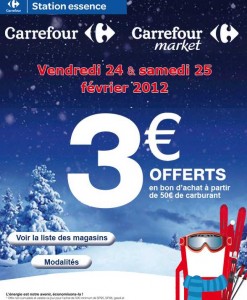 Nouvelle offre carburant dans les magasins carrefour (hyper et supermarchés ) les 24 et 25 fevrier 2012 , avec un bon d’achat de 3 euros offert pour un plein d’au moins 50 euros de carburants ..
