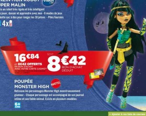 Si vous avez des petites filles fans des monster high et que vous comptez leur offrir des poupées pour noel , tres bonne affaire du coté de geant casino .. En effet dans le catalogue jouet qui va jusqu’au 1er decembre on peut voir les poupées vendues 16.84 euros faisant l’objet de 50% de credit en bon d’achat .. Le prix de revient final n’est donc que de 8.42 euros …
