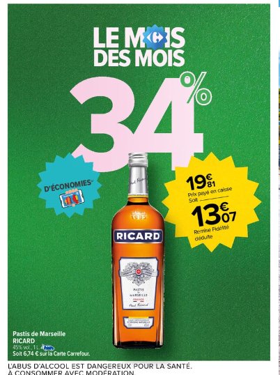 Bouteille Pastis Ricard 1litre à 13€ euros chez carrefour market