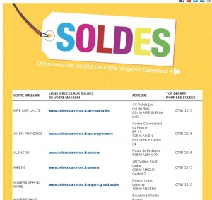 Les soldes débutent le 7 janvier 2015 … L’enseigne carrefour à mis en place une page web à partir de laquelle on peut accederer aux listes des articles qui seront soldés dans chacun des magasins …