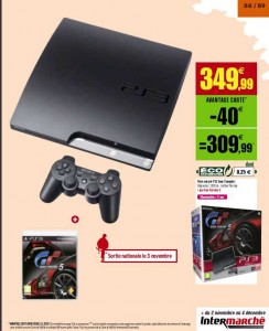 Tout comme avec la Nintendo Wii , les magasins intermarchés vont proposer des super prix pour le pack Sony PS3 320Go avec le jeu Gran Tourismo5 . Le Prix de ce pack sera normallement de 349 € , cependant si on est possesseur de la carte de fidelité gratuite des magasins intermarchés , elle ne reviendra qu’à 309,99 euros.
