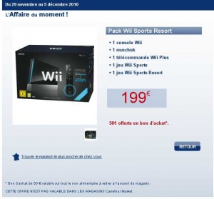 Vous desirez acheter une console wii ? Encore un bon plan pour cela si vous etes client chez carrefour :  en effet du 29/11 au 5 decembre , le Pack Wii Noire ( wii + wiisport + wiisportresort), vendu 199 euros donne droit à un bon d’achat de 50 euros .
