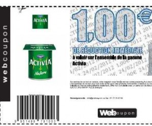 Si vous consommez des yaourts Danone Activia , voici une offre qui peut vous interesser : En effet , en vous inscrivant gratuitement sur le site de danone activia qui donne des conseils de santé .. vous obtenez immediatement un bon de reduction de 1 euro à imprimer et à présenter en caisse et valable pour l’achat de n’importe quel type de yaourt activia .. Sur un paquet de 4 yahourts , un bon de 1 euro represente plus des 2/3 du prix .